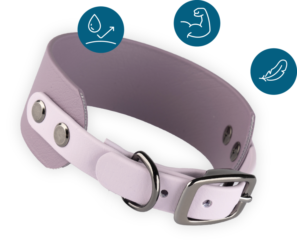 Carefully designed with sighthounds in mind, the Biothane collars feature a wide 38mm band to protect their delicate necks and a unique slim-to-wide shape to enhance security and prevent escapes. This thoughtful design ensures both comfort and safety for all breeds.